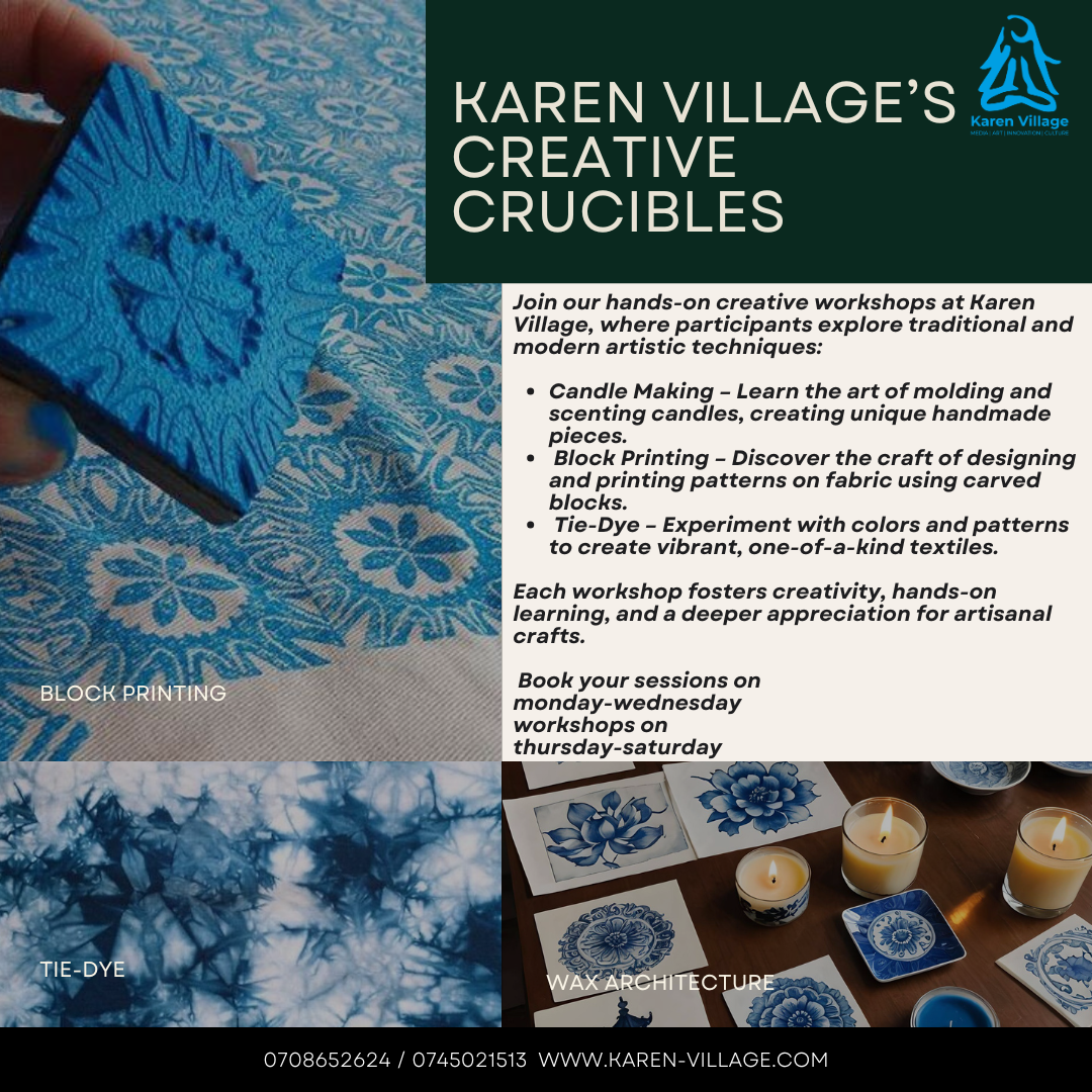Experience a Stay-cation Creative Workshop at Karen Village—a perfect blend of relaxation and artistic exploration. Nestled in a vibrant cultural hub, our workshops offer a chance to unplug, express, and connect with like-minded creatives. Whether it’s painting concepts, wax architecture,block printing design,tie-dye workshop,glass architecture, or ceramic architecture, immerse yourself in hands-on sessions led by local artisans. Enjoy the serene ambience, engage with Kenya’s rich artistic heritage, and leave feeling rejuvenated and inspired.